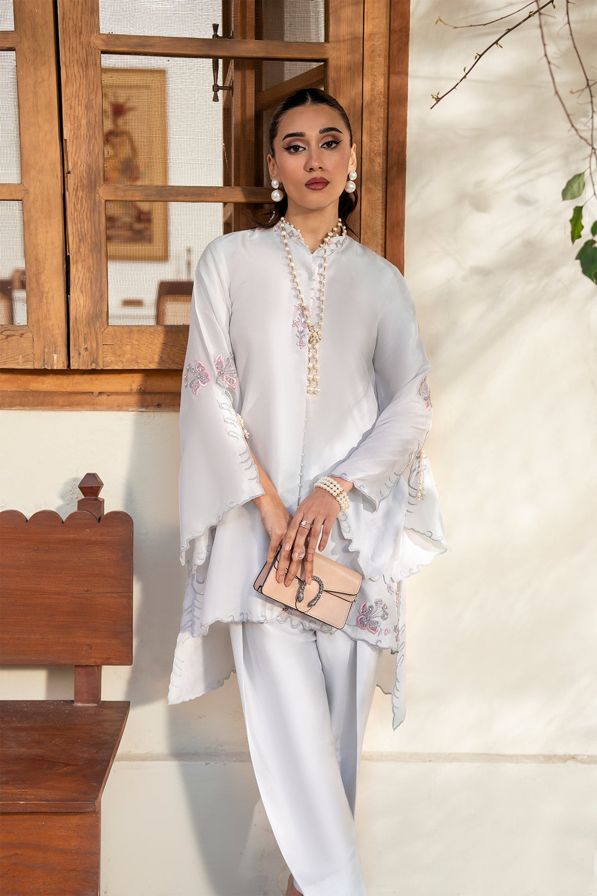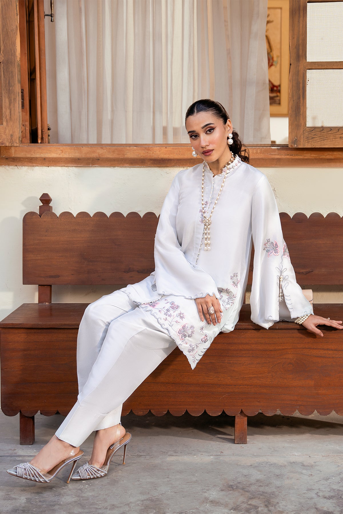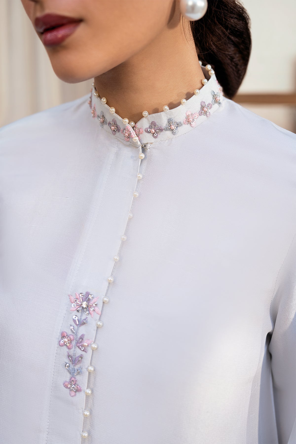 Uber Trendy outfit- blue rose is a look apart. A beautiful pastel shade of pink on a pure rawsilk canvas, this outfit is a must have for upcoming festive season. A short trendy shirt with embellished flared sleeves paired with a straight shalwar