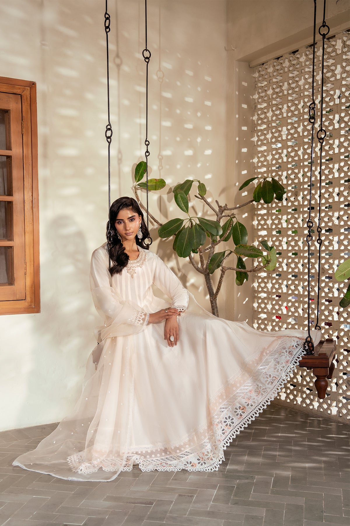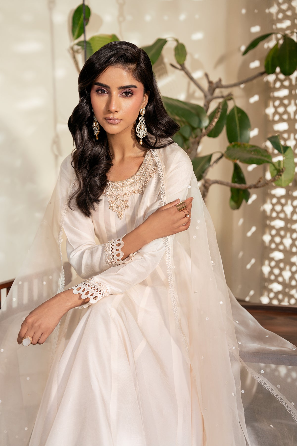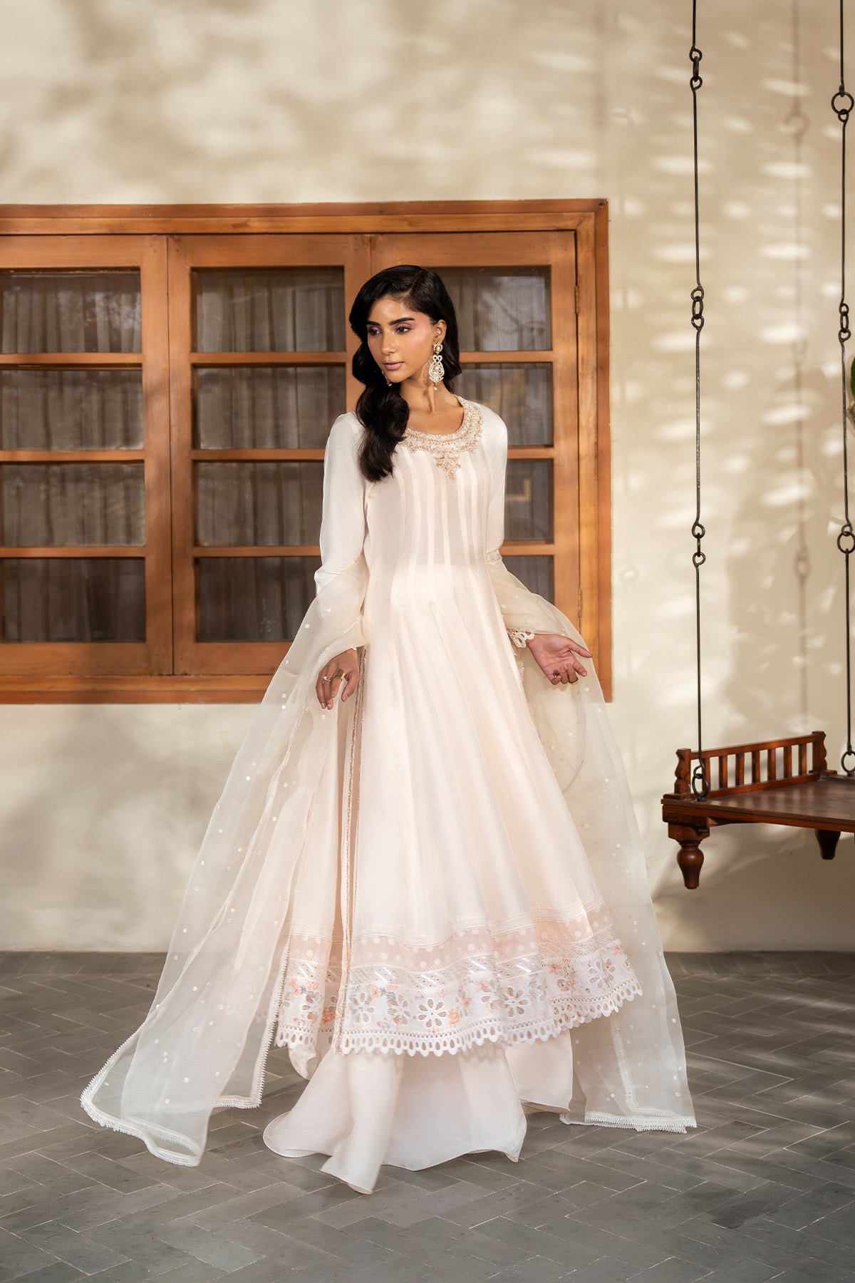 A feminine peach kalidaar paired with a shararah and organza dubatta will definitely make you feel like a princess during this festive season. This elegant kalidaar adorns in peach jewelled hand embellished neckline which