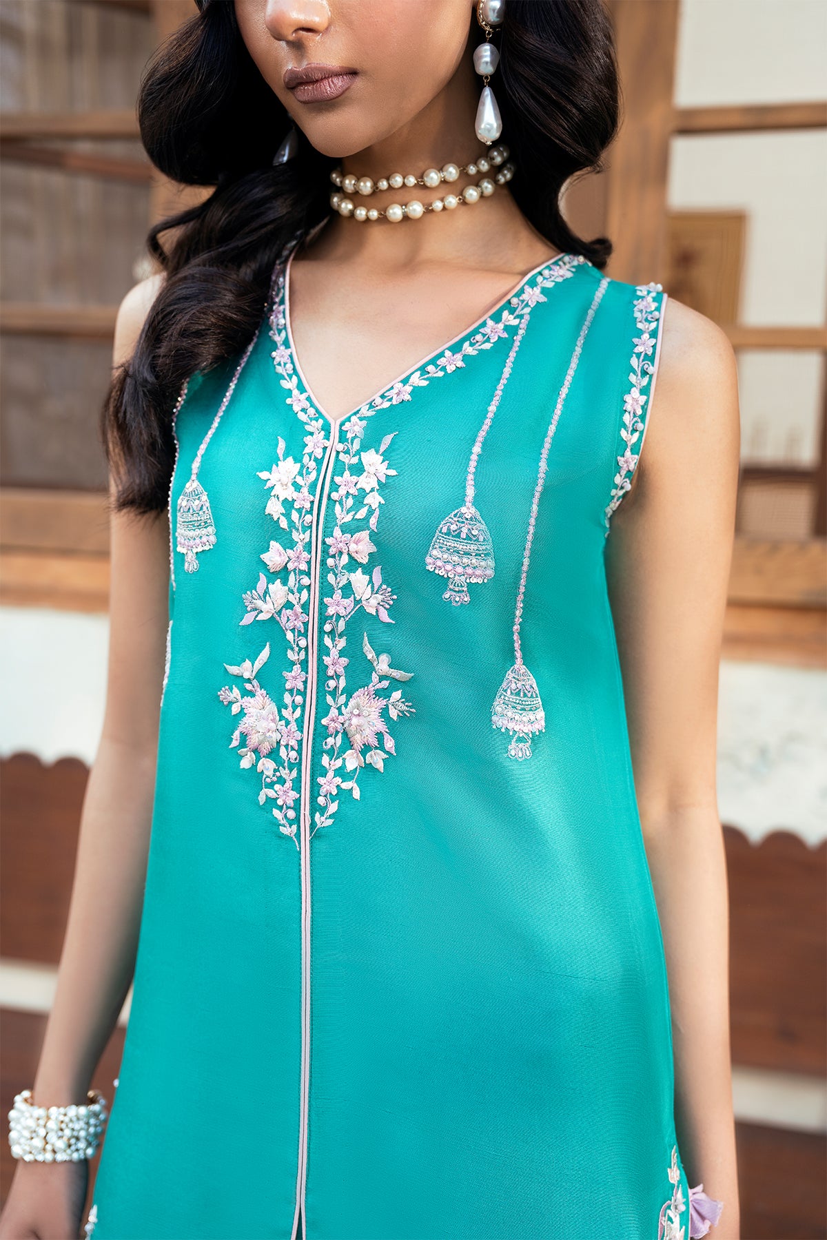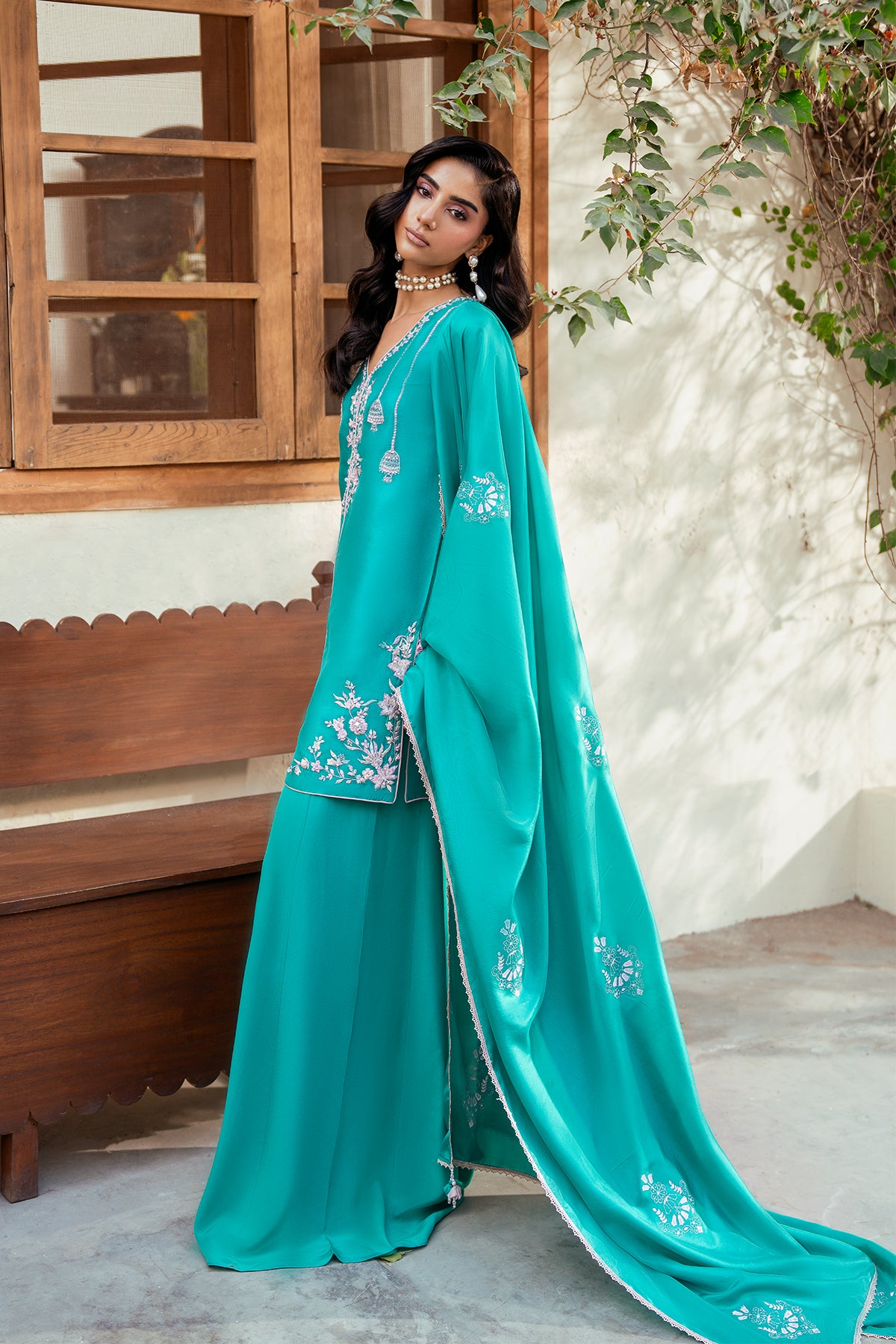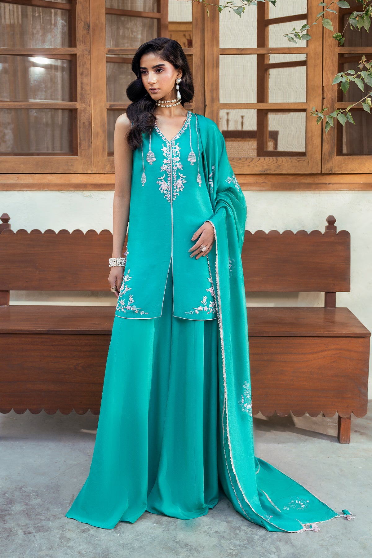 A unique fresh shade of green on pure silk ccanvas with hints of baby pink floral embroidery on the neckline and the hem of the shirt, Inka is a beautiful rich outfit fit for the upcoming festivities.. Paired with a shararah pants and pure silk dubatta, this outfit can be worn on multiple occasions.