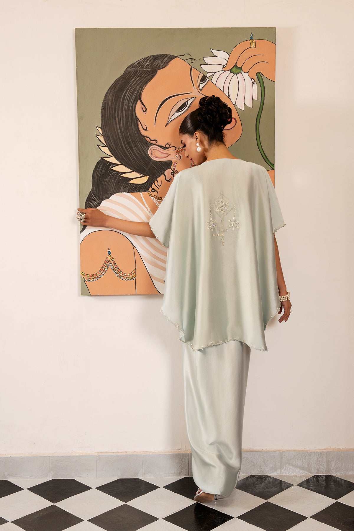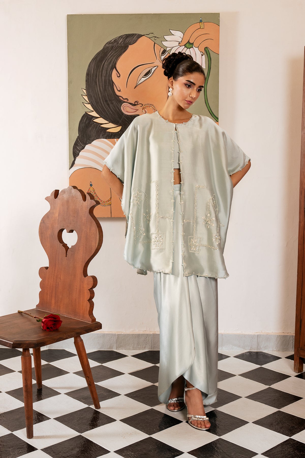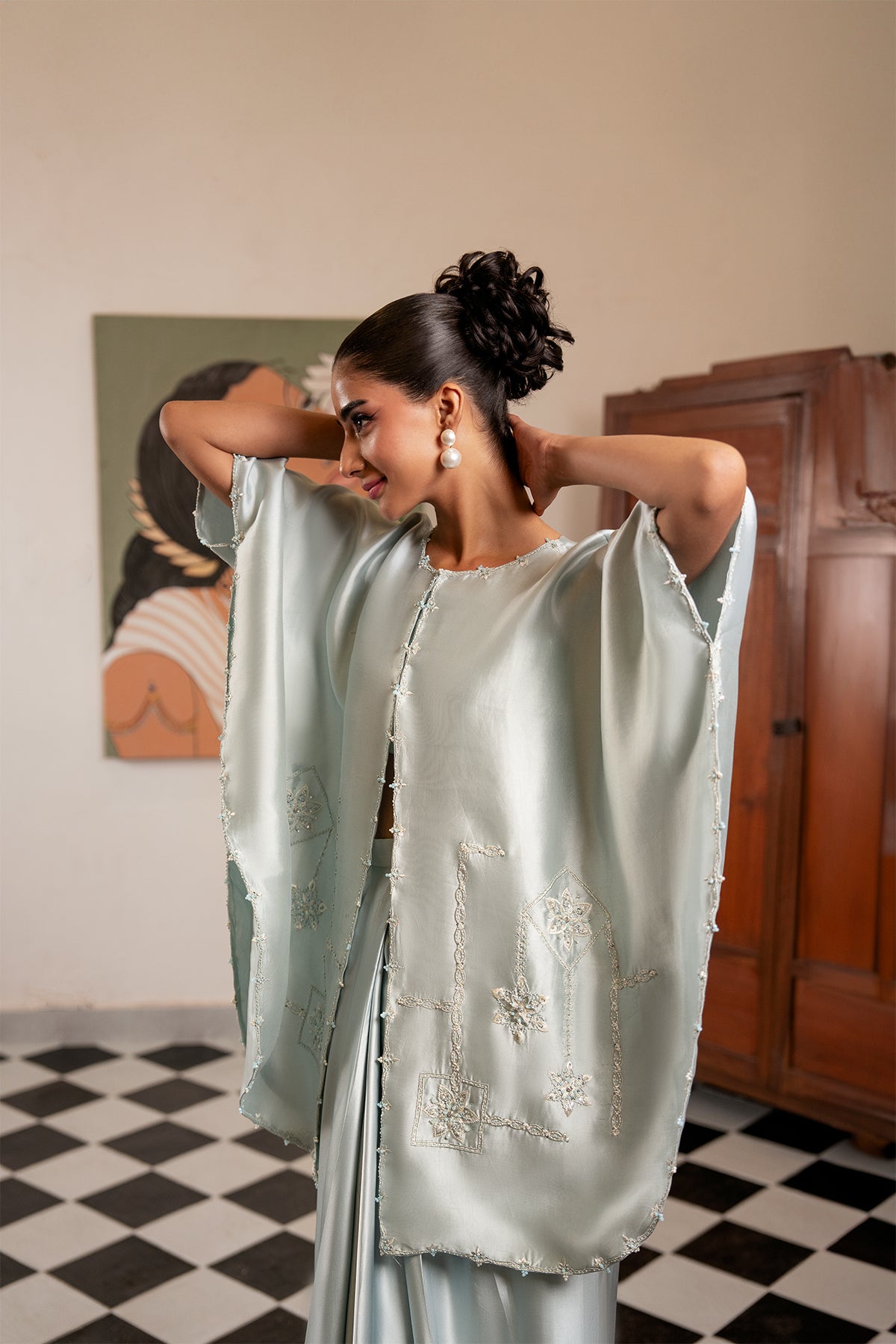 Trendy and uber chic- Marbella is a short ice blue cape paired with the trending pleated skirt and a inner slip. Abstract motives are crafted along the front and the back of the cape which are further enhan