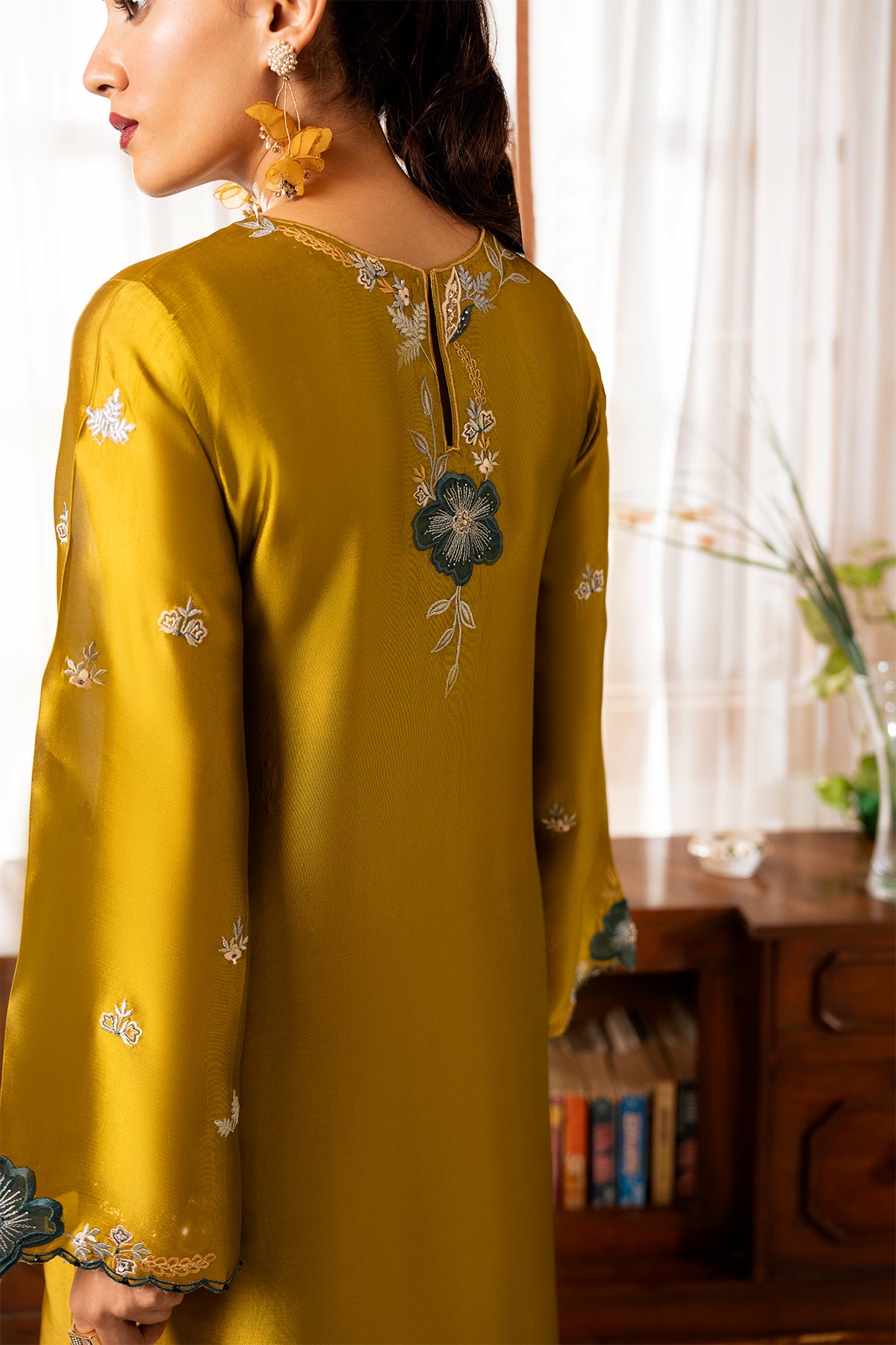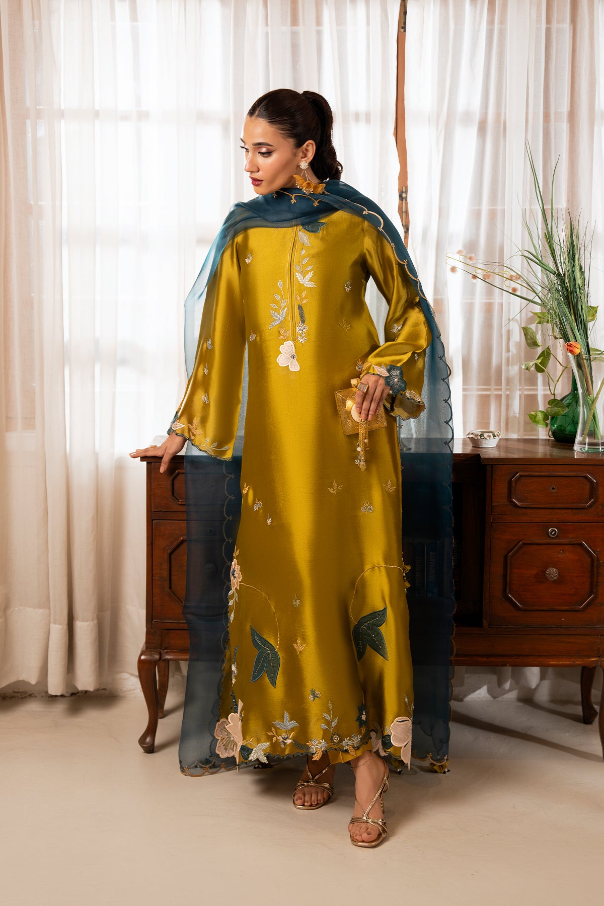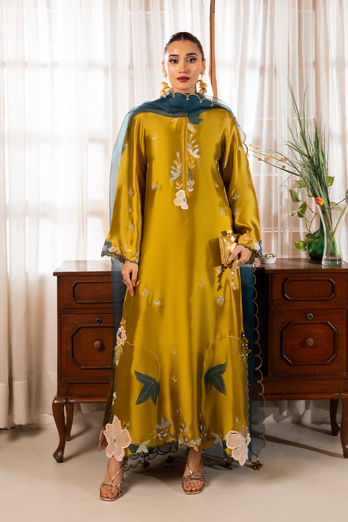 Mustard long kaftan shirt with beautiful patchwork floral embroidery in shades of teal and pink give this outfit a beautiful festive feel. Perfect for this festive season musetti is paired with a contrasting teal organza dubatta with feminine touches of a scalloped boarder