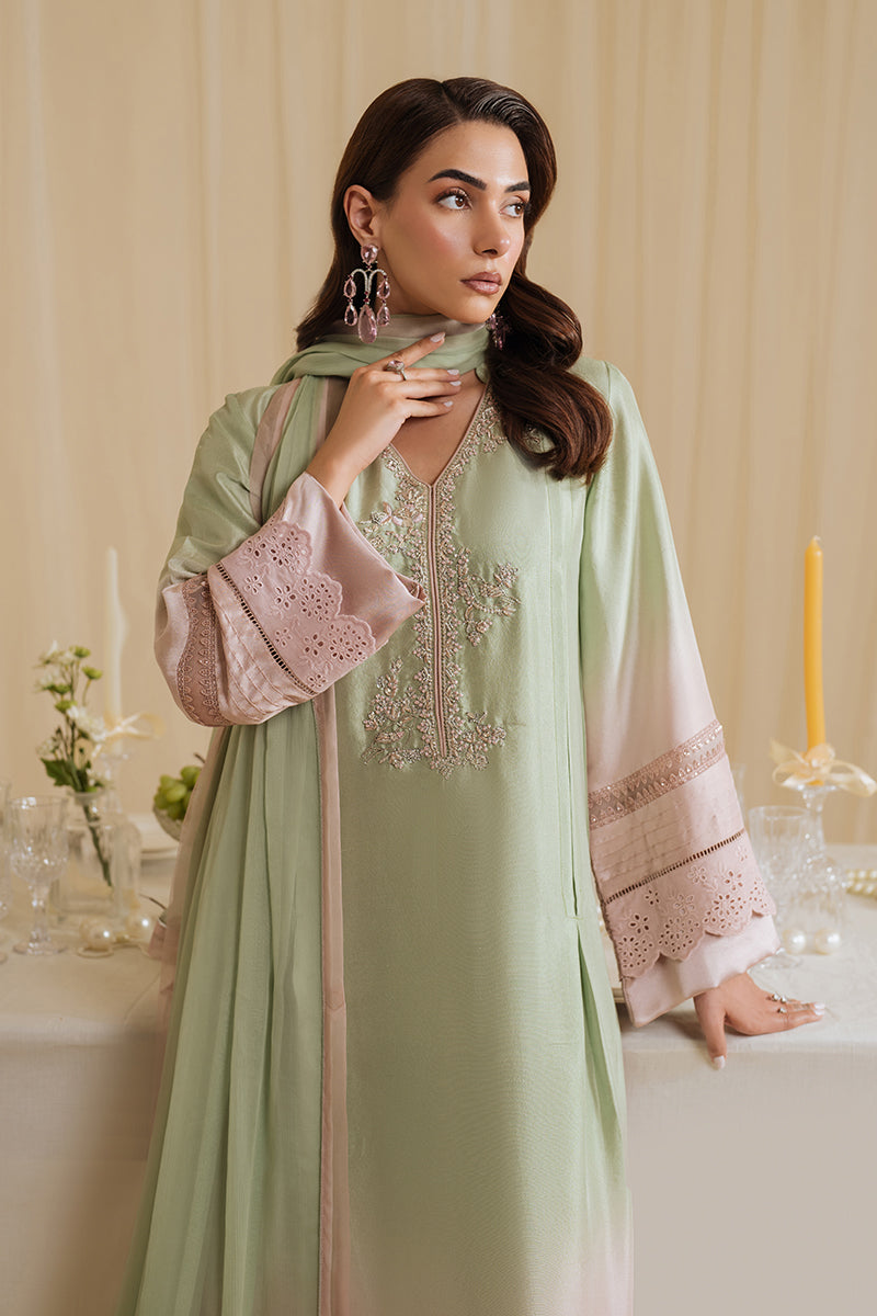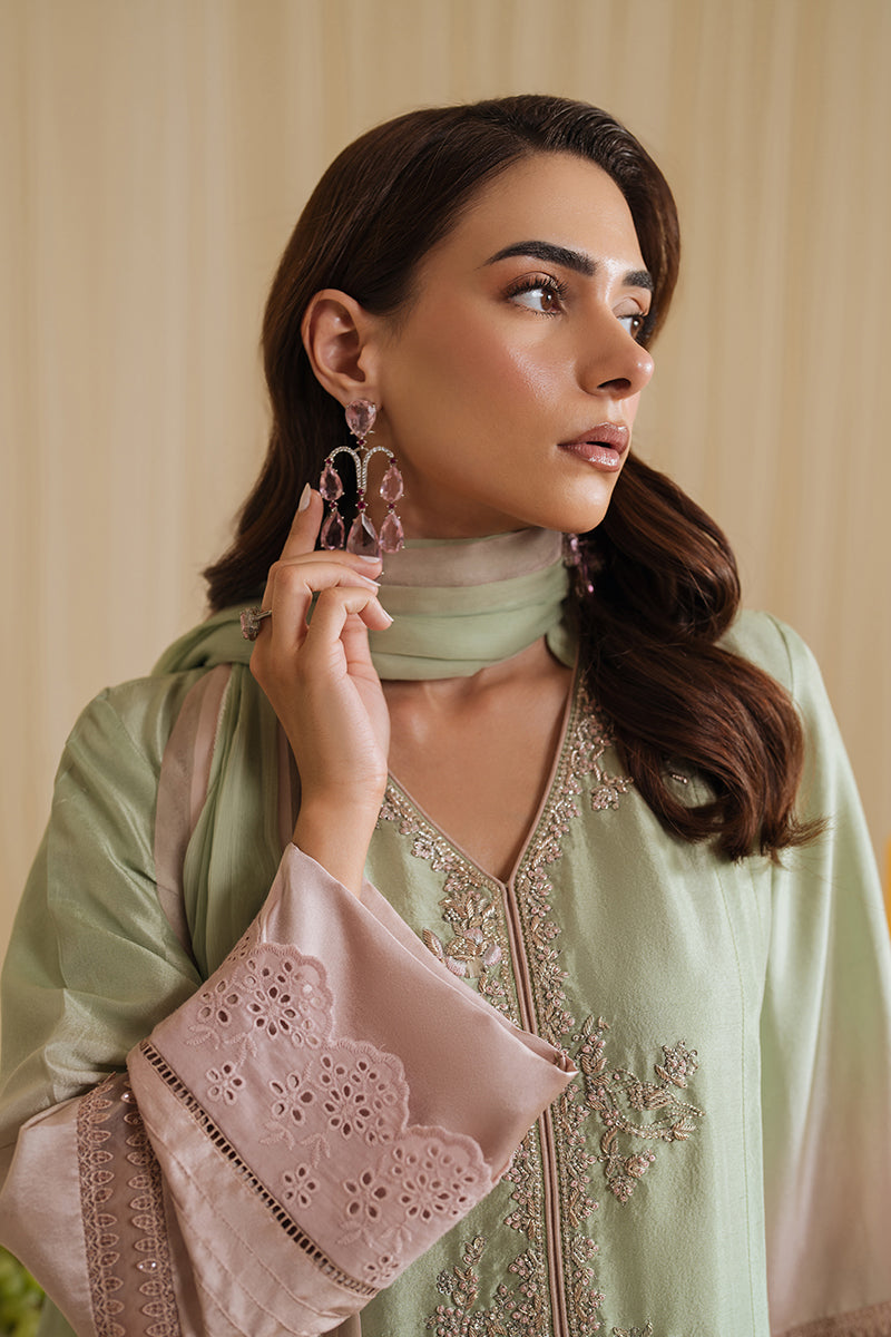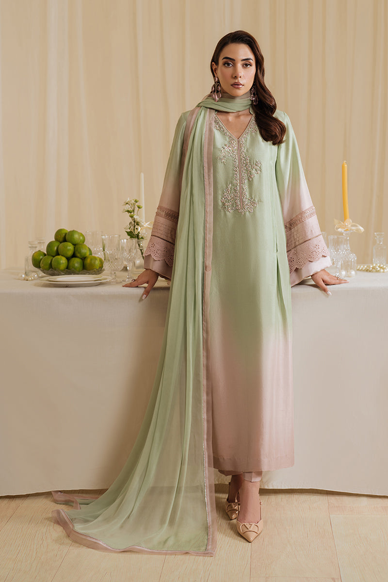 Fairy tale vibes, thats what shay gives us. mesmerizing pastel ombre effect enhances the beauty of the outfit. A classic long kurta cut shirt with box pleats on the sides is flattering on all body types. Silver hand embellished work is done along the V shaped neckline adding shine to the outfit.