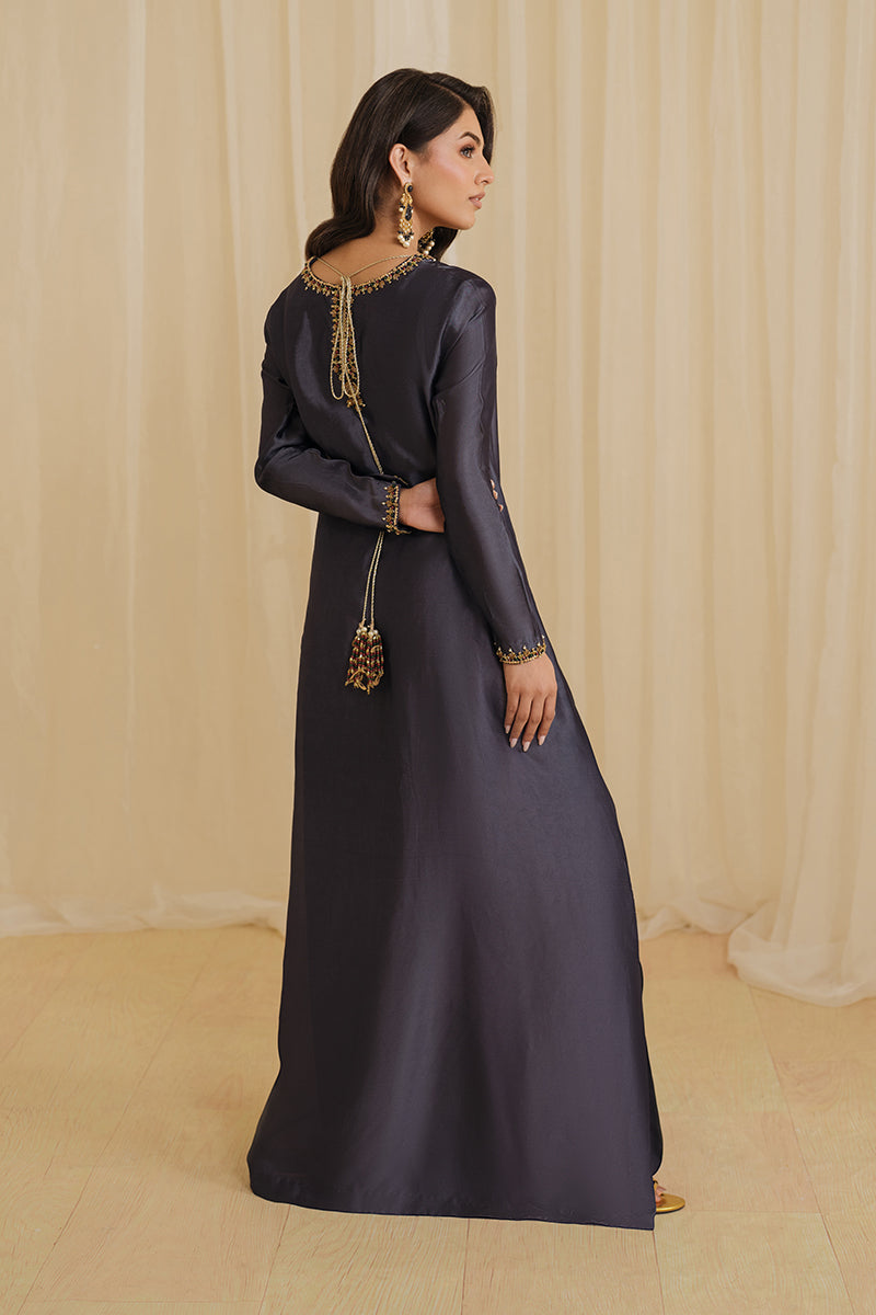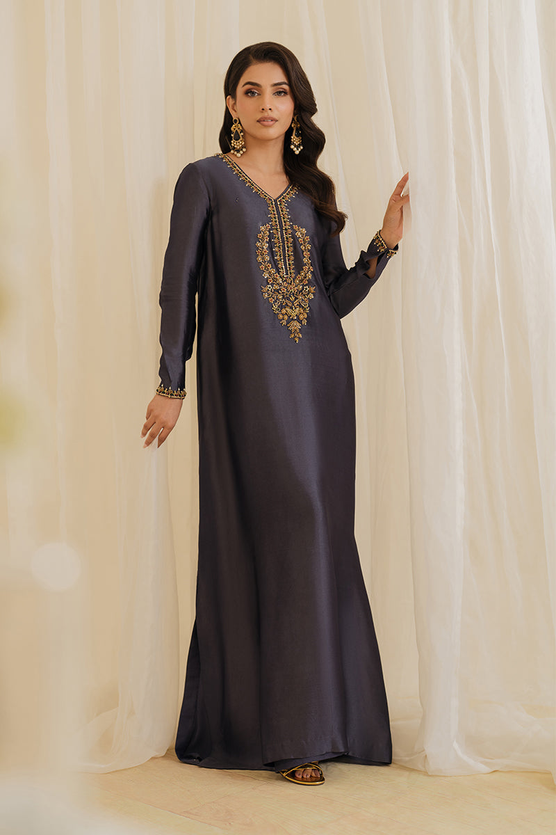 Floor length kaftan shirt with a beautiful hand embellished neckline with precious stones adds a subtle sparkle to the shirt. you can wear this outfit on a special night out by pairing it with navy stilettos and statement earrings.