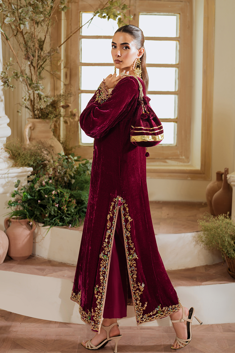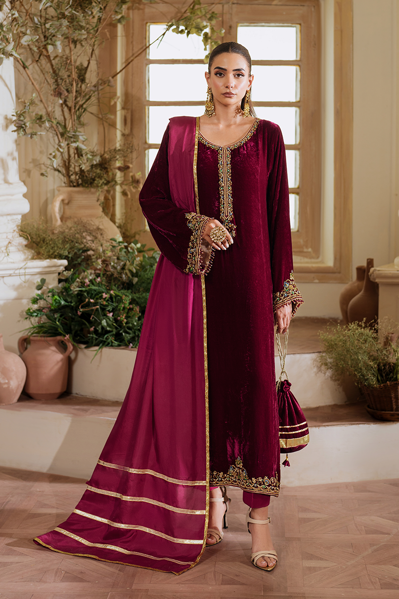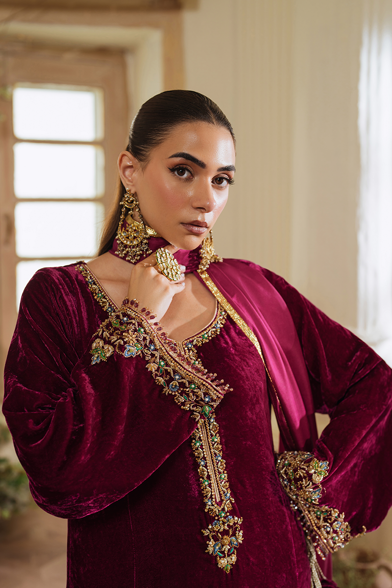 A fun shade of hot pink in a long, lush velvet shirt with hints of turquoise, thread woven beautifully along the hemline, along the neckline and edge of the sleeves. Paired with a pure raw silk trouser and a pure silk dupatta. You can dress this beautiful outfit up with some gold heels and cute matching potli, and big statement earring.