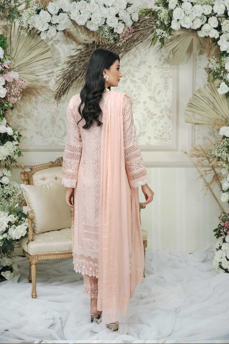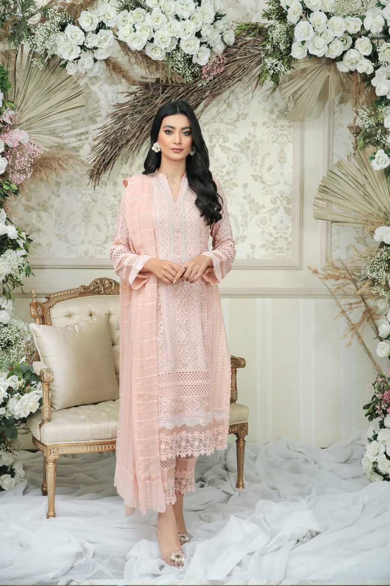 This classic outfit should be in everyones wardrobe, the gorgeous chikan kari fabric edged with laces on the hemline and the edge of the sleeves. Crystal work on the neckline on the neckline adds a bit on bling to the whole outfit. Paired with pure rawsilk lace trousers. and a chiffon dubatta.