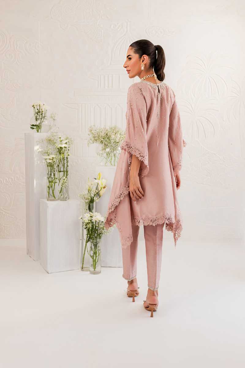 Pure Raw silk kaftan with a burst of pearls and crystals giving it a beautiful sparkle for those summer festivities! Edged with a unique cutwork detailing giving it an elegant touch, this outfit is sure to turn some head at a dinner party. Pair this kaftan up with straight cut, hand embellished trousers (as shown), a sleek ponytail and high sparkly heels, to show that glamorous neckline, and back detailing.