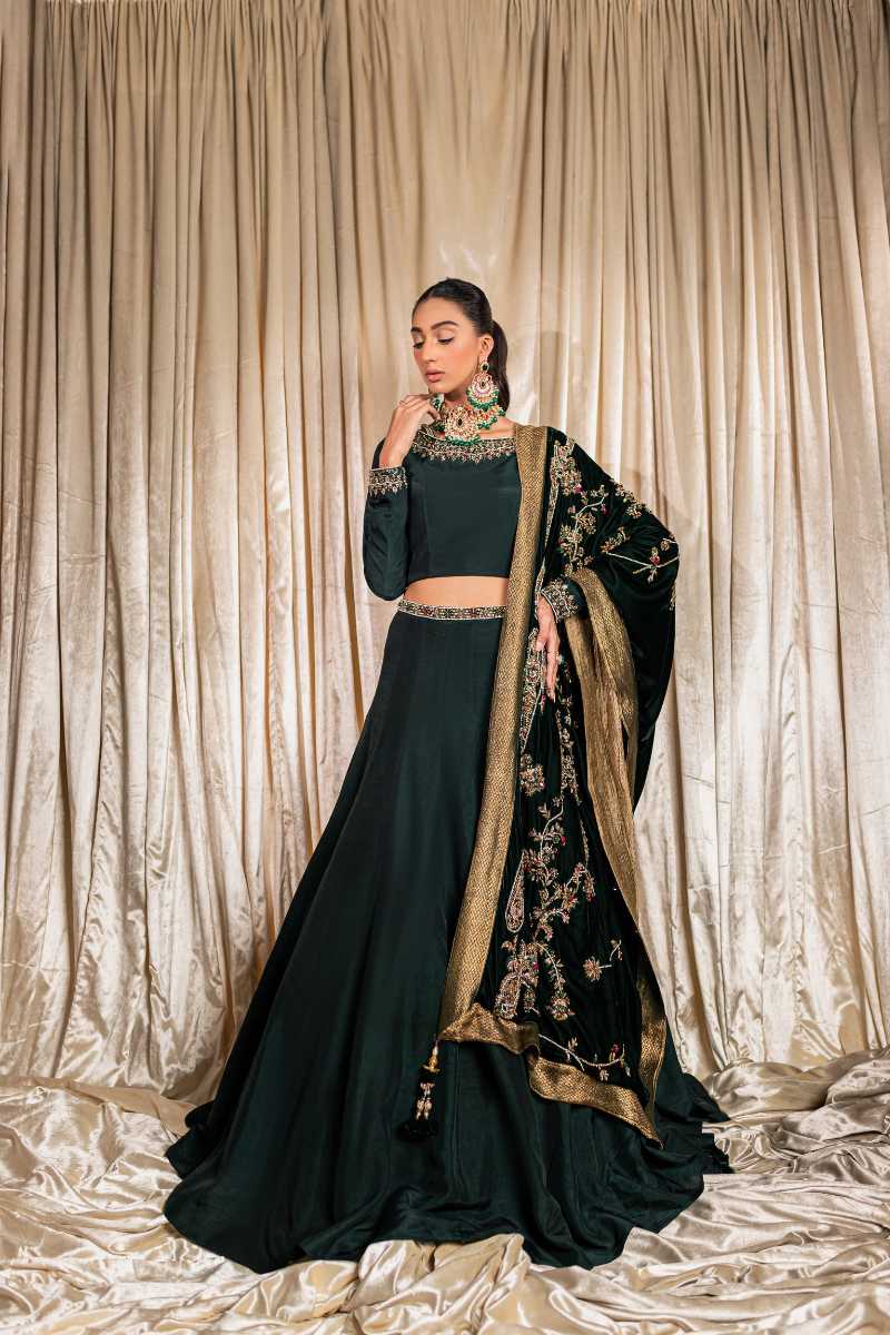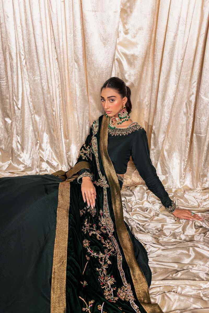 This enchanting piece Nisa is the epitome of the Royal Legacy, an immaculate dark emerald green pure velvet shawl embellished with gorgeous artisan hand-work with dapka and touches of ruby and emerald.