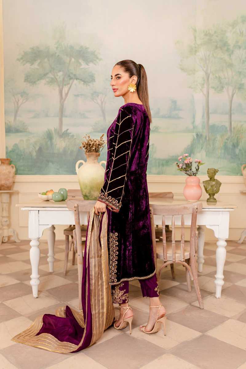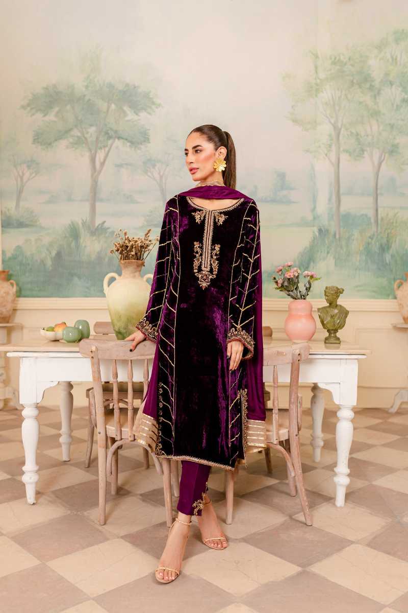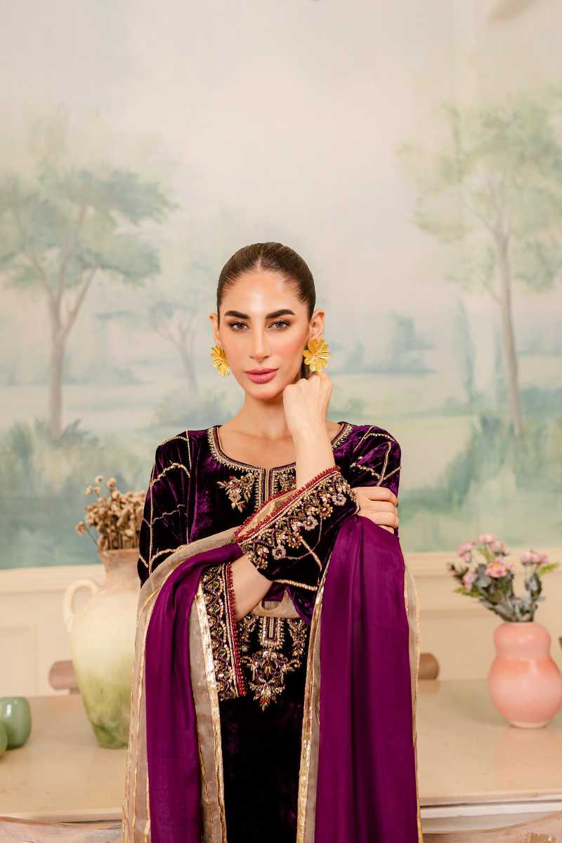 This timeless outfit in a royal plum color is the ultimate outfit to add to your wedding wardrobe. the boxy silhouette is flattering on all body types. Intricate dabka and crystal work is scattered on the shirt. elegantly detailed pure silk dupatta. This outfit can be paired with pure raw silk trousers with a hand embellished motif.