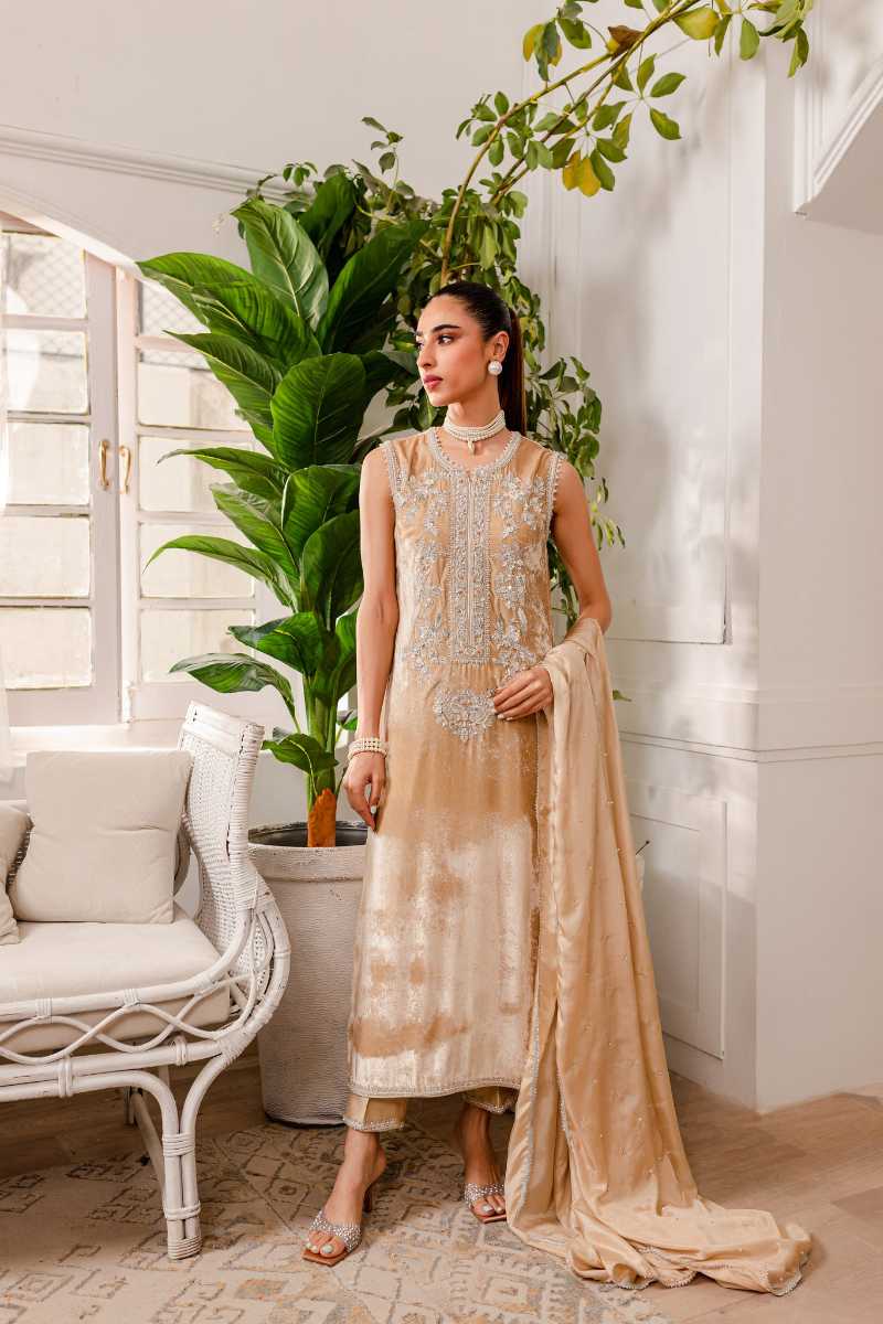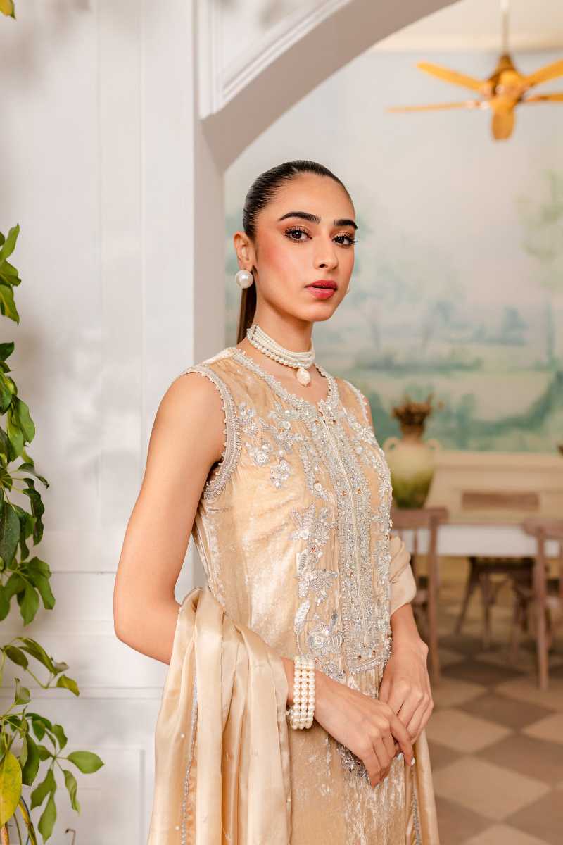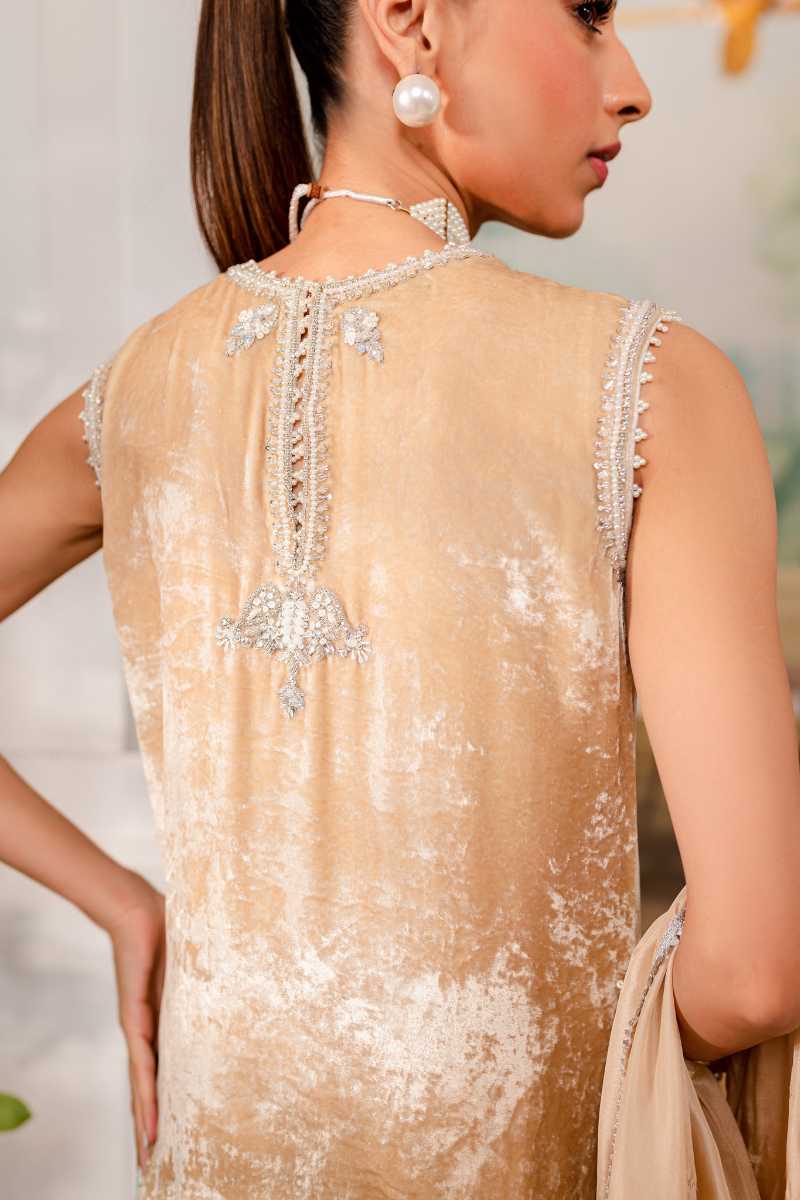 Pastel velvets have a special charm, this beautiful fawn velvet with a heavy hand worked silver worked neckline, is a trendy piece from our couture in velvets collection. paired with a silk dupatta and Korean silk trousers.