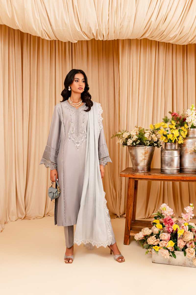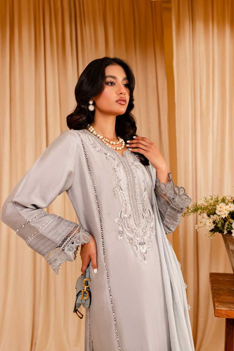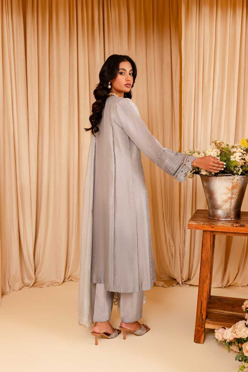 Our signature ombre kurta in hues of grey on pure raw silk fabric. The elegant neckline of the kurta is adorned with embroidery, hand embellished crystals and dabka to give it that oomph and sparkle. So many tiny details have been added, from silk trimmings to hand made buttons. its sure to make you look and feel good. paired with a lace trimmed dupatta and pure raw silk trousers.