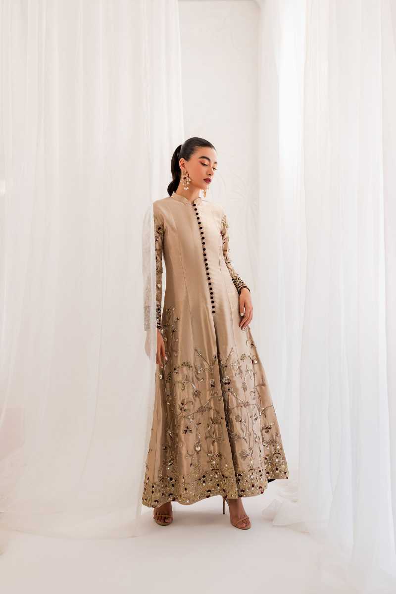 Steller gold tissue gown, beautifully hand embellished with old school- thread work, dabka and crystals. A classic formal for the with a modern silhouette, this ensemble can be paired with puffed Lehenga or straight trousers.