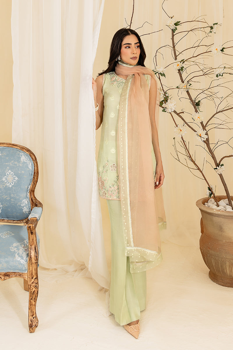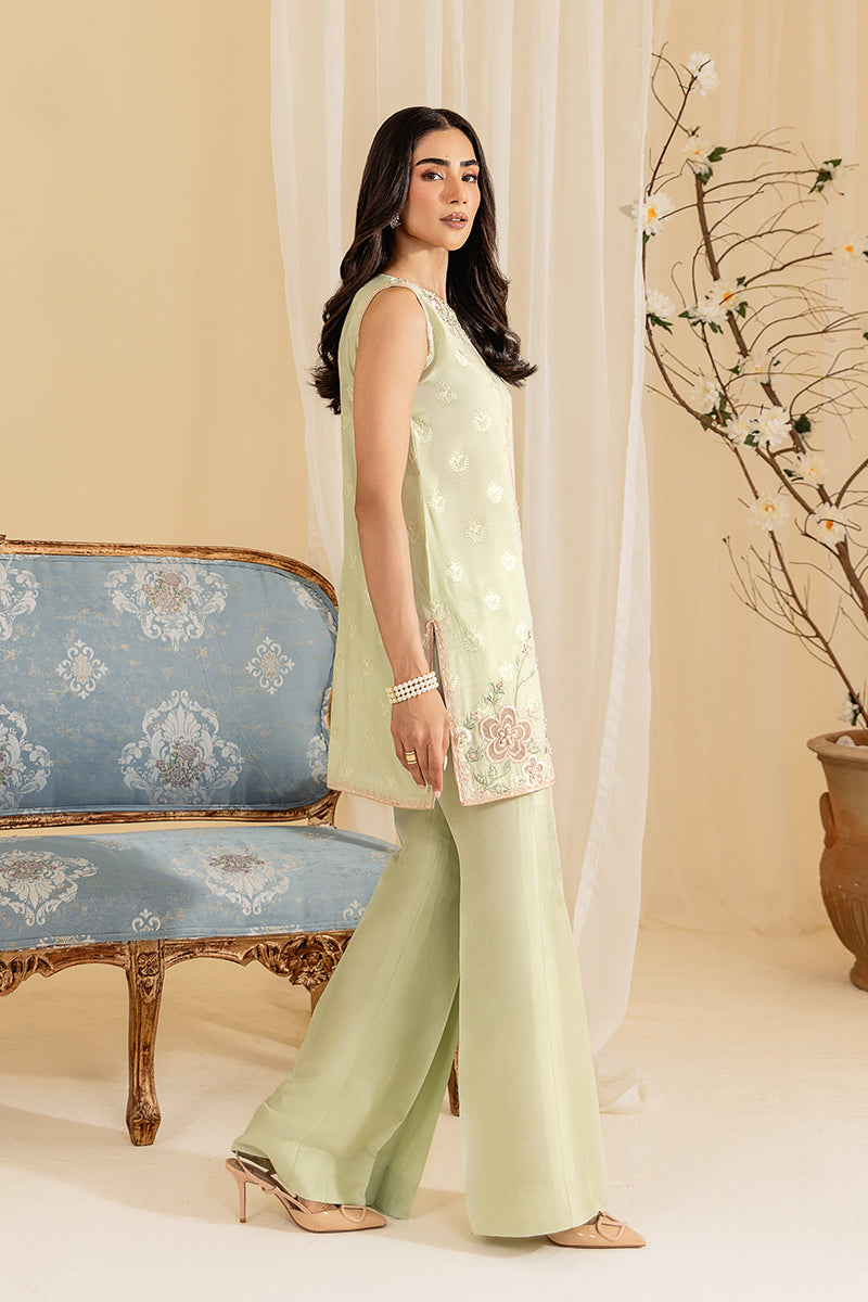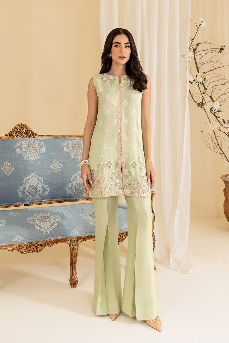 A trendy straight cut short kurta in a refreshing shade of mint green, with hand appliqued rose boarder. this outfit sets the bar high! delicate hand embellished details on the neckline add to the glam of the outfit. paired with pleated boot cut trousers and a soft candy pink organza dupatta.