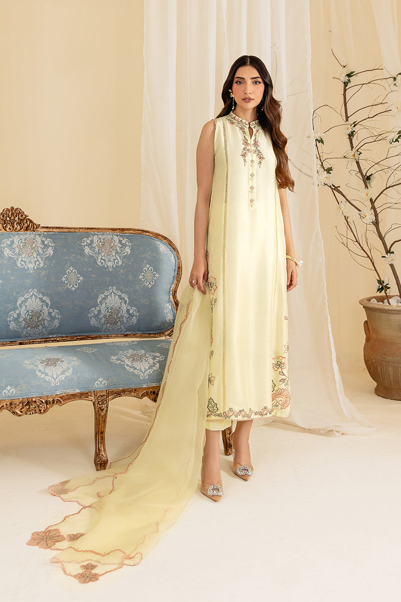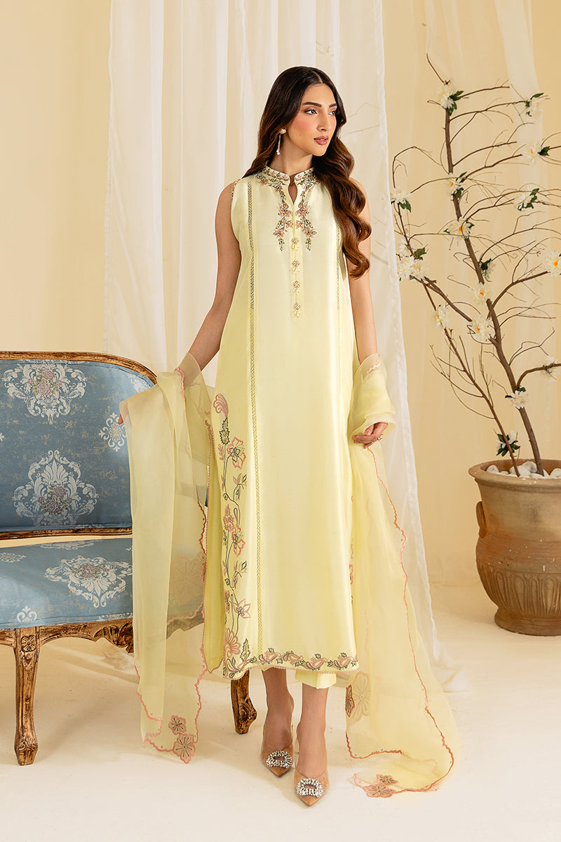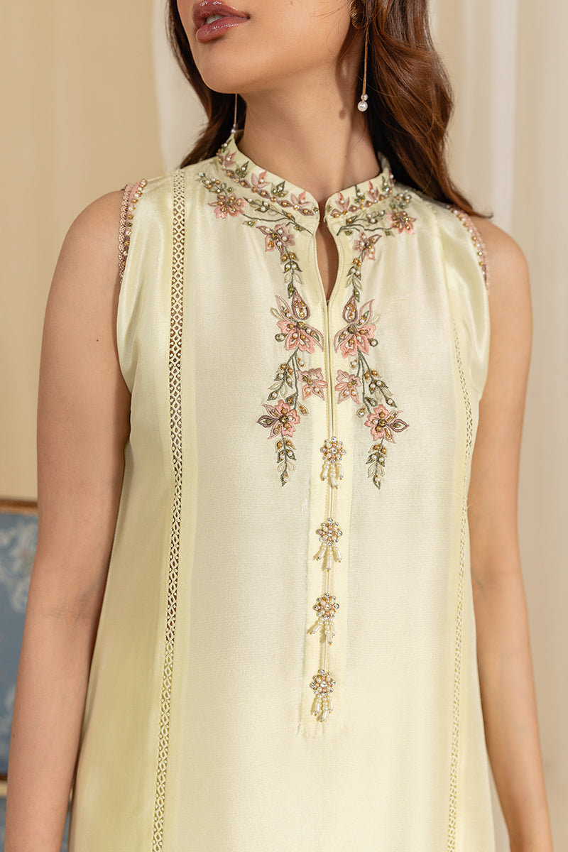 A dreamy shade of pastel yellow in a classic kurta silhouette. Lamiasha is a elegant outfit with floral elements added in the embroidery along the hem of the shirt, along with embellished neckline to add a bit of sparkle to the outfit. Paired with straight trousers and a beautifully embodied organza dupatta