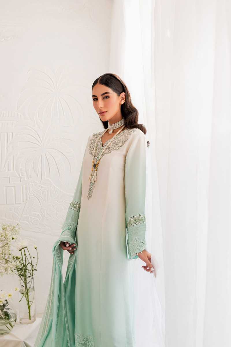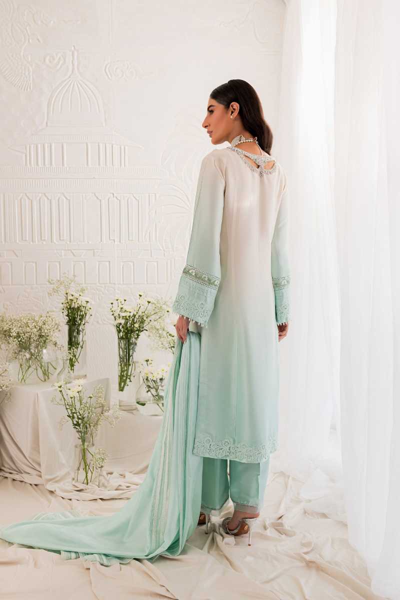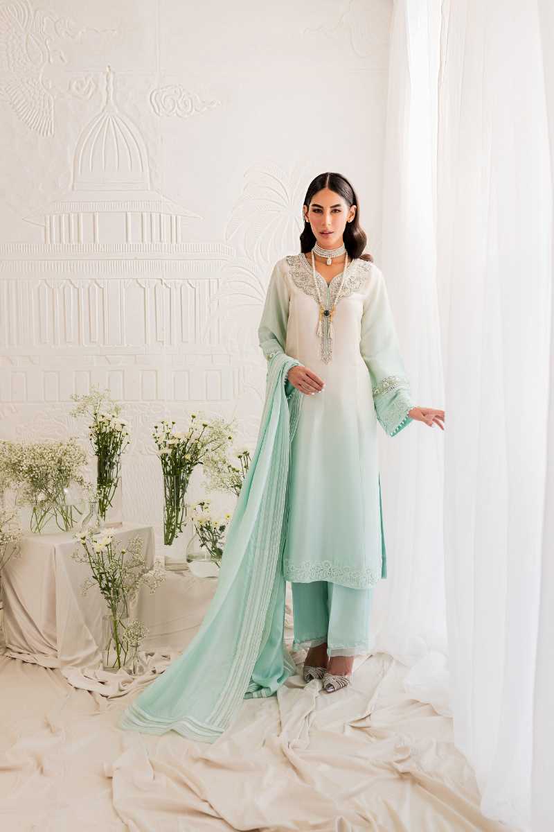Cerise's classic dreamy hues of mint on a rich raw silk fabric. Dazzling embroidery around the neckline and lace details elevates the outfit. pair it with culottes ( as shown )