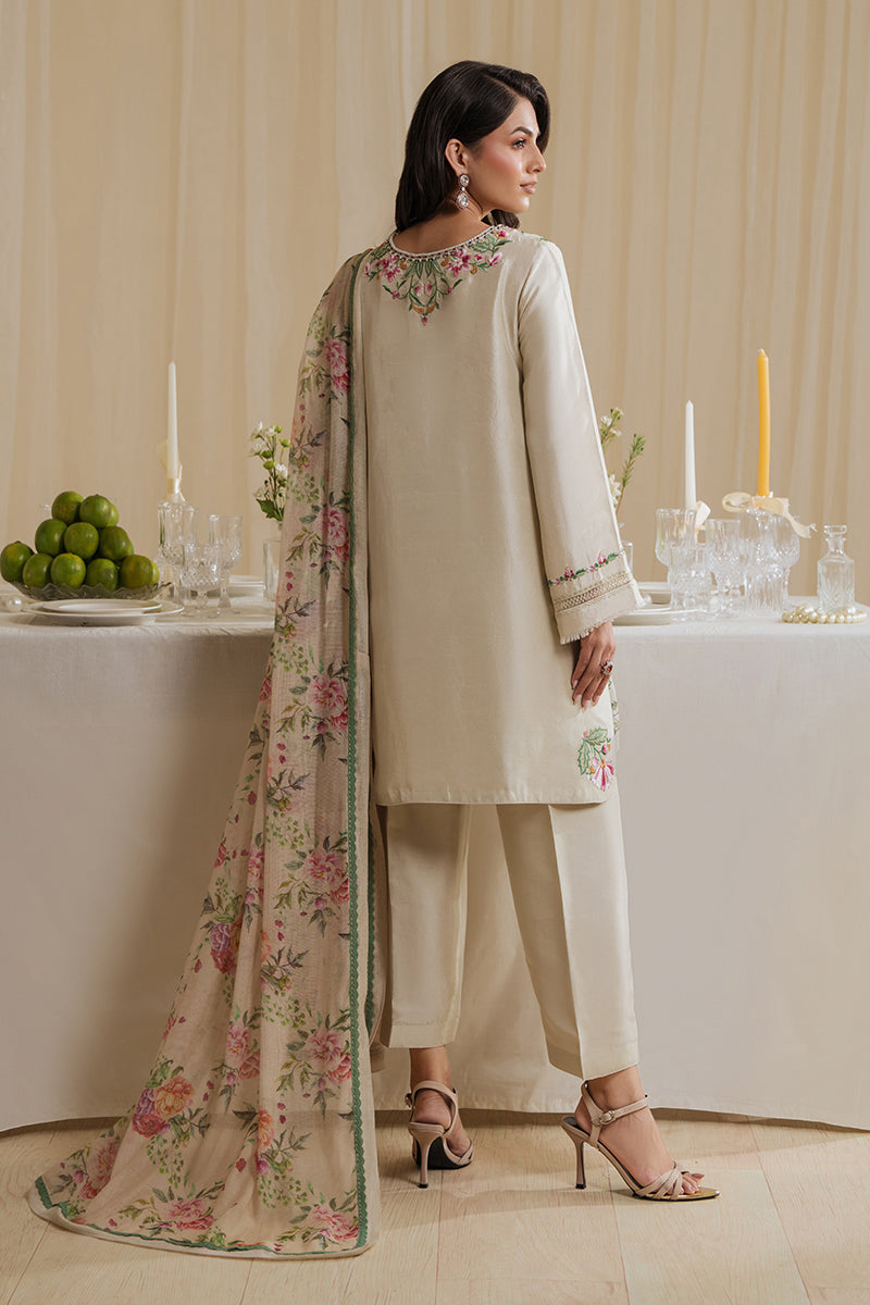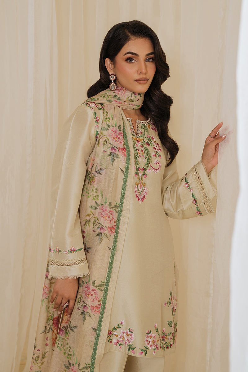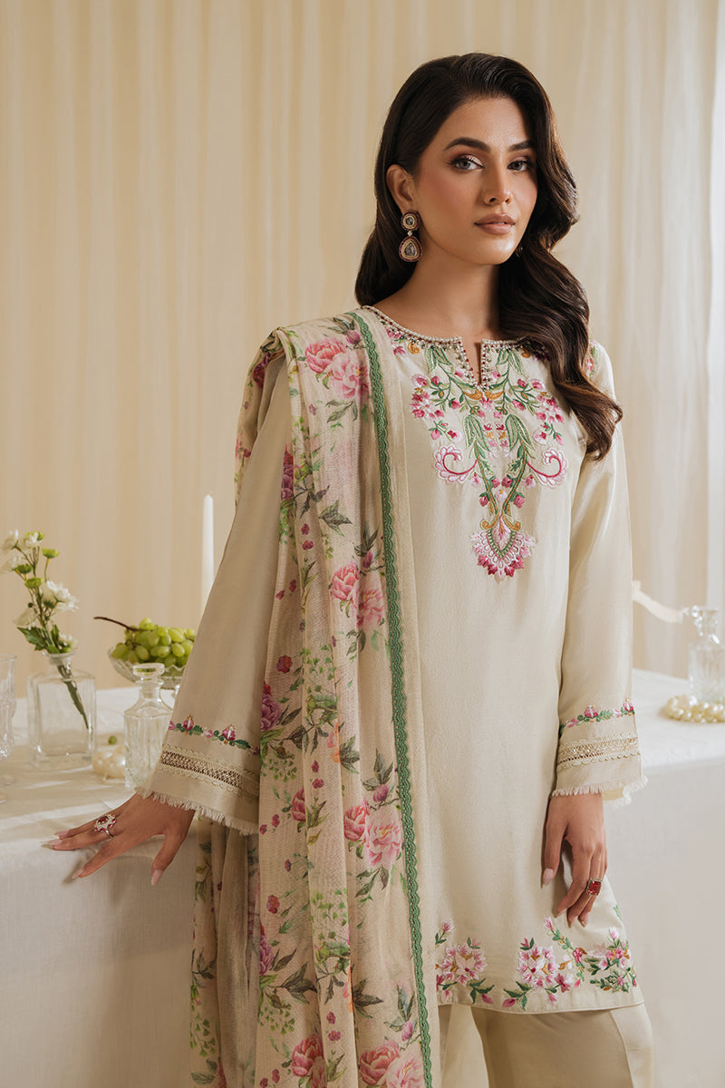 A steller outfit, with an ivory base and colored floral embroidery, giving the outfit a soft feminine touch. This chic short shirt loved by everyone is paired with a vibrant floral pattern dupatta edged with delicate lace and a pure silk shalwar.