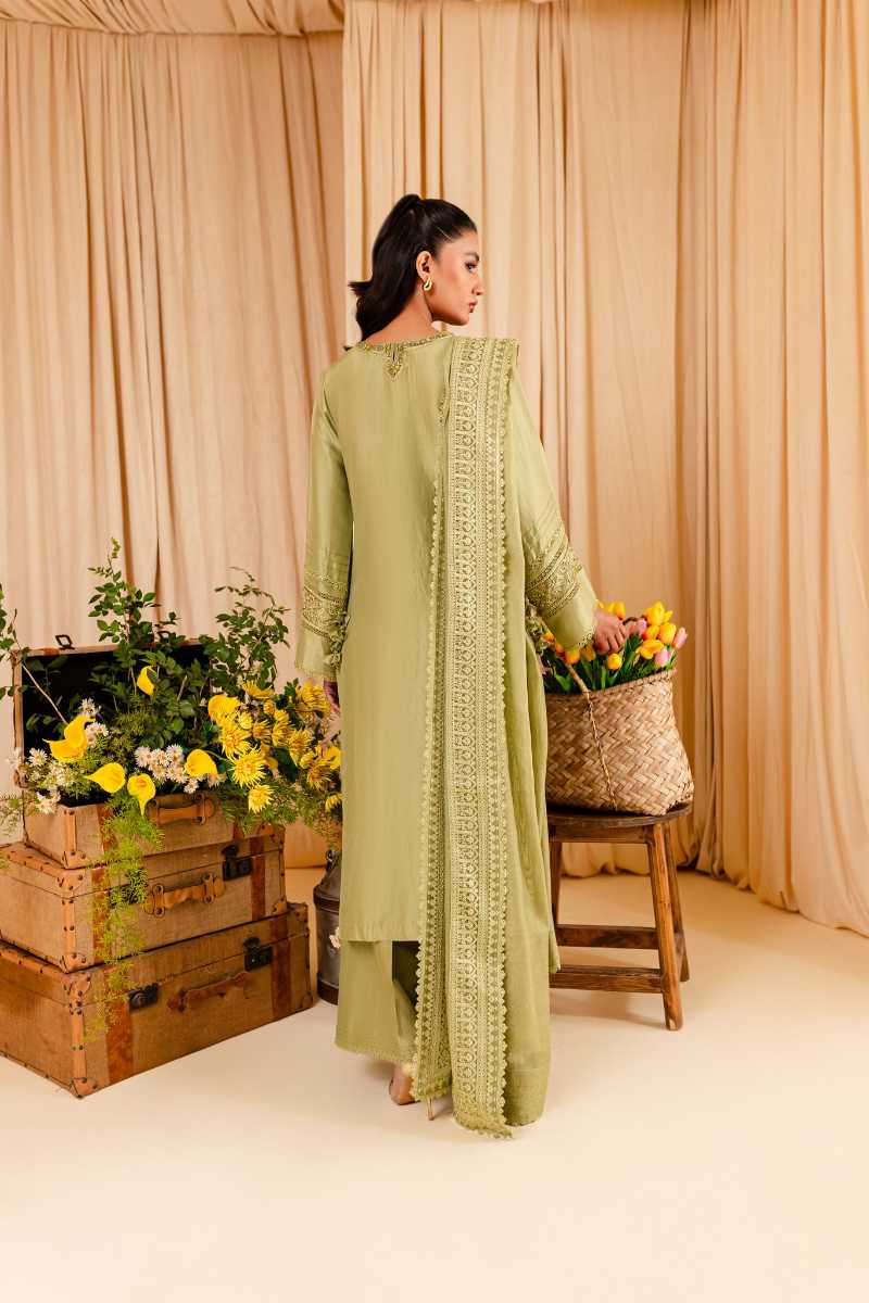 A unique shade of green kurta on a luxe pure raw silk, is definitely a trendsetter this Eid. Delicate hand embellishments on the neckline and sleeves add glamour to the outfit. Paired with rawsilk cullots, and a cotton net dupatta.