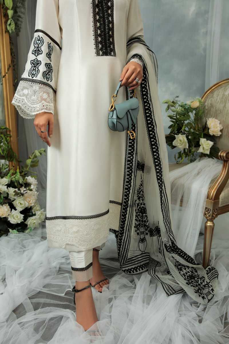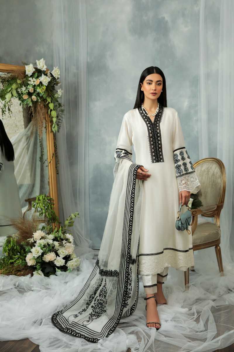this pure white rawsilk kurta is a wardrobe essential. you can never go wrong with the classic combination of black and white. This elegant kurta is paired with a stunning heavily embroided organza dubatta.